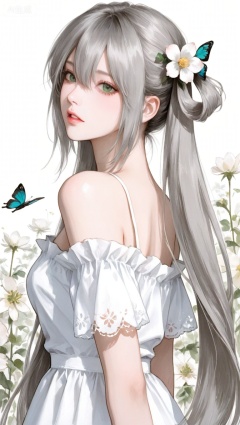 1girl, solo, long hair, looking at viewer, bangs, hair ornament, dress, ribbon, hair between eyes, bare shoulders, twintails, very long hair, green eyes, flower, grey hair, cowboy shot, parted lips, hair flower, off shoulder, white dress, from side, bug, white flower, butterfly, hair rings, off-shoulder dress