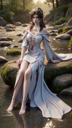 (masterpiece:1.3), ultra-detailed, 8k, photorealistic, best quality, cinematic lighting, volumetric sunlight, soft shadows, subsurface scattering, depth of field, A stunning young woman sits gracefully barefoot on a moss-covered rock beside a crystal-clear stream in a tranquil forest. The sunlight filters through the trees, casting dappled golden light on her smooth skin and the rippling water. She wears an exquisite long dress with fine pink and gold embroidery across the chest and short sleeves. Her long, dark hair flows naturally over her shoulders, softly illuminated by the warm light. Her bare feet touch the cool moss and shallow water, adding a sense of intimacy and realism. One hand rests gently on her hip, while the other holds a blooming lotus flower, her expression calm and serene. Mist rises gently from the water, with reflections dancing on the surface, creating a peaceful, ethereal atmosphere. (background with mossy stones, flowing stream, forest sunlight, soft haze, and gentle reflections:1.6), (realistic skin texture:1.3), (natural color tones:1.3), (film look:1.2) (huge breasts:2.99),(full breasts:2.99), ,