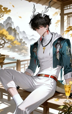 JianXingZhu \(Return of the Dragon Tide\)solo, short hair, shirt, black hair, red eyes, gloves, long sleeves, 1boy, jewelry, sitting, closed mouth, jacket, tail, white shirt, male focus, earrings, outdoors, horns, black gloves, pants, fingerless gloves, necklace, open jacket, tree, feet out of frame, leaf, tassel, dragon horns, beads, mountain, white pants, dragon tail, branch, antlers, bishounen, tassel earrings