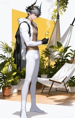 1boy,male focus,gloves,solo,pointy ears,black gloves,red eyes,looking at viewer,holding,upper body,earrings,jewelry,long sleeves,long hair,grey hair,horns,smoke,jacket,black jacket,hair between eyes,from side,grey background,shirt,Logos_\(Arknights\),looking at viewer, simple background, white background, holding, closed mouth, standing, full body, male focus, pants, weibo username