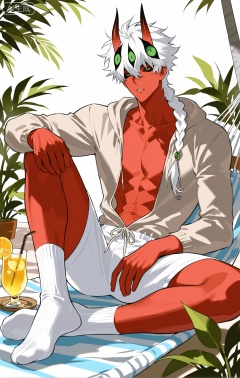 xiaozhitiao,dianmei,1boy,bangs ,socks,white socks,dianmei (artist:mazjojo:0.53),(artist:pigeon666:0.37),(artist:zawar379:0.57),(artist:remsrar:0.35),(artist:yoneyama mai:0.64),(yokoyari mengo:0.6),1boy,male focus,solo,medium - length wavy hair,hooded pajamas,hood down, a light - brown knitted scarf draped over his shoulders, his toned abs visible as he dozes off in a hammock on a wooden patio. The hammock is strung between two posts, and there's a small side table with a half - read book and a glass of lemonade. Potted ferns line the edges of the patio, and the afternoon sun casts a warm, yellow glow.,White bodysuit