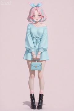 masterpiece, best quality, amazing quality, very aesthetic, absurdres, newest,1girl, blush, boots, bow, bracelet, full body, hair bow, hair ornament, hair ribbon, high heels, holding, jewelry, long sleeves, multicolored hair, necklace, off shoulder, open mouth, parted bangs, pastel colors, pink hair, ribbon, shoes, short hair, simple background, socks, standing, straight-on