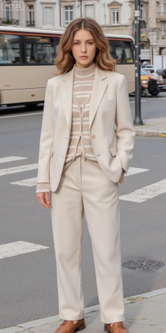 hubggirl,Photograph of a stylish woman with wavy auburn hair, wearing a cream-colored suit, striped sweater, and brown loafers, standing on a city street. A vintage cream-colored bus blurs by in the background. The scene is set in an urban environment with classic architecture.