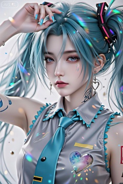light particles, lens halo Extreme aesthetics, the best quality, good quality, the latest, 2024, 2023, very aesthetic, absurd, visual impact, tense shots Ultra-high resolution, 32K ultra-high definition, clear focus, superior image quality, masterpiece, emotional, unconventional supreme masterpiece, exquisite details, gentle atmosphere, high-end texture, fashionable photography style (Visual Impact: 1.2), give the poster a dynamic and visually stunning appearance, with an impactful picture, official art, rich colors, color splashing, cinematic perspective Masterpiece, the best quality, astonishing quality, very aesthetic, absurd, the best quality, the latest Girl, Hatsune Miku, bow, heart shape, bow, tie, earrings, shirt, jewelry, nail polish, upper body, bun, bangs, solo, bare shoulders, collared shirt, sleeveless, watercolor nails, blue bow, watercolor eyes, watercolor hair, tattoo, white background, blue nails, piercings, ear piercings, raise hand, watercolor tie, sleeveless shirt, gray shirt Hair accessory, blue eyes, hair band, shut mouth, ear arch, facial mark, hair between the eyes,Lqiqi