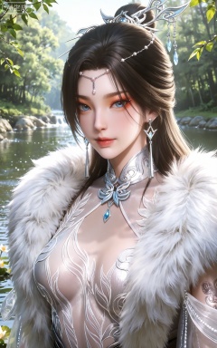masterpiece,high quality,tall,game cg,highres,(soft light:1.2),white_skin,(shiny_skin:0.6),(realistic:1.1),,nangongxianer,1girl,solo,jewelry,blue eyes,earrings,upper body,hair ornament,long hair,dress,looking at viewer,white dress,brown hair,fur trim,closed mouth,facial mark,breasts,hair bun,tattoo,black hair,outdoor,nature,water,river,day,flowers,glass,