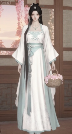 YanYun_style,1girl, solo, long hair, black hair, hair ornament, long sleeves, dress, holding, jewelry, very long hair, full body, flower, necklace, white dress, chinese clothes, forehead mark, basket, hanfu,