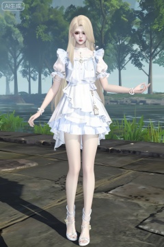 这是一张游戏CGI风格图,描绘了一位年轻女子,皮肤苍白,面孔精致。站在户外,背景是宁静的树木和一片水域。这个角色穿着一件白色的、有多层褶边的衣服,包括短袖和裙子。他们戴着臂章,穿着设计复杂的高跟凉鞋。这个角色有一头长长的金发,一只手向外伸出,另一只手在肘部弯曲。地面是用石头砌成的,水边有一片片绿色的植被。整个场景有一种宁静而略带神秘的气氛。