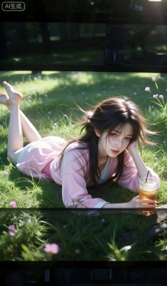 一张摄像录像机显示屏截图,美女,夏天,日系复古切茶室,微风,长发,粉色穿搭,拿着饮料。害羞,突出头发凌乱美,灵动转身,富士胶卷相片,大阳光,不清晰,大颗粒感,过度曝光,冷调,回忆感,真实照片质感, 薇尔莉特特写,发丝凌乱透冷光,反光水润玻璃感晕染唇釉,魅惑又天真凝视镜头,电影级冷暖光对冲,明暗高对比,超精3D肌肤粒子(细腻肌肤/绒毛),柔焦虚化背景,胶片颗粒质感。画面发光特效,焦点锁定眼部折射光斑。 12. 左侧画面侧躺草丛,双腿屈膝抬起不触地13. 中间画面双臂环抱胸前,头微微低垂15度14. 右侧画面单手撑头,眼神直视镜头15. 头型姿态自然放松,展现惬意状态16. 背景为茂密绿色草丛,点缀零星粉色小花18. 整体风格为清纯风,略带纯欲感19. 光线均匀柔和,营造清新氛围20. 画面干净纯粹,突出少女美好形象21. 服装细节:上衣袖口微卷,短裤有细微褶皱,MNI