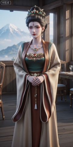 The main subject is a woman wearing gorgeous ancient costumes. Her black hair is styled into a high bun, decorated with delicate gold and green hair accessories, and a red flower on her forehead. Wearing a dark green tube top with golden patterns and gemstones on the inside, an off-white and brown gradient robe on the outside, a gold belt with tassels hanging around the waist. The background is a distant mountain shrouded in clouds and mist. The characters stand in a wooden corridor with wooden tables and chairs beside them. The overall tone is cool and elegant, the painting style is realistic and delicate, and the light and shadow are soft, creating a fairy-like ancient atmosphere.,huaxiangr,ZICHU-DLNN