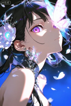yoneyama mai,1girl,butterfly,bug,solo,hair ornament,long hair,black hair,purple eyes,flower,dress,jewelry,hair rings,upper body,earrings,petals,bare shoulders,hair flower,closed mouth,glowing butterfly,NDAN yoneyama mai,solo,looking at viewer,blurry,chromatic aberration,(extremely detailed CG unity 8k wallpaper,masterpiece),(8k resolution),Khighres,hi res,best quality,masterpiece,intricate,details,absurdres,Close-up shot of the face,Rainbow-like light,depth of field,dynamic compositio,