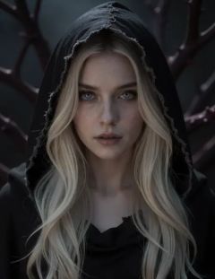 A close-up portrait draws the viewer into the presence of a mysterious female sorceress, her long platinum blonde hair flowing in silken waves over her shoulders, strands catching faint highlights as if touched by unseen magic, while her piercing eyes lock forward with hypnotic intensity, rendered in hyper-realistic detail that reveals crystalline reflections and layered depth within the irises; her pale skin appears smooth and flawless, softly luminous against the surrounding darkness, accented by subtle freckles that scatter naturally across her cheeks and nose, lending an anime-inspired delicacy without breaking realism; she is wrapped in a dark, tattered hooded cloak that drapes gracefully around her form, its heavy fabric textured with frayed edges, worn seams, and fine fibers visible under dramatic lighting, suggesting age, ritual, and power earned through time; the hood frames her face in shadow, allowing ambient light to sculpt her features with precision, casting soft gradients along her cheekbones and jaw while deeper shadows pool beneath the brow and collar; behind her, a moody gothic backdrop emerges in shallow focus, twisted thorn-like branches clawing upward and outward, their silhouettes blurred into an atmospheric web that feels alive and ominous; the lighting is cinematic and controlled, with cool ambient shadows balanced by faint directional highlights that separate her from the background; captured as if with a high-resolution camera body and wide aperture, the depth of field falls away quickly, isolating her face in razor-sharp focus while the world behind dissolves into dark, mystical abstraction, creating an image that feels intimate, powerful, and quietly dangerous.