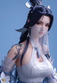 score_9,score_8_up,score_7_up,1girl,solo,realistic,(looking at viewer:1.1),1girl,solo,realistic,big breasts,veil,mouth veil,dress,white dress,white flower,tassel,chinese clothes,halter dress,detached sleeves,see-through sleeves,see-through,long sleeves,clothing cutout,cleavage cutout,blue dress,realistic,jewelry,hair ornament,earrings,1girl,solo,realistic,(mature face:1.2),big eye,(pale_skin:1.1),shiny_skin,slender face,long hair,black hair,hair bun,forehead mark,facial mark,blue eyes,eyelashes,bare shoulders,closed mouth,realistic,solid background,simple background,(magazine cover theme:0.75),(white chair:0.8),<lora:小巳-绫清竹pony:0.85>,