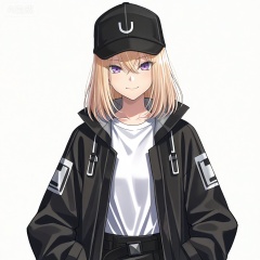 masterpiece, best quality,solo,white background,simple_background,Misumi Uika,cybersaki_style,blonde hair bangs,purple eyes,smile,medium hair,hair between eyes,white shirt,baseball cap,black coat,open coat,open clothes,jacket