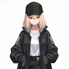 masterpiece, best quality,solo,white background,simple_background,Misumi Uika,cybersaki_style,blonde hair bangs,purple eyes,smile,medium hair,hair between eyes,white shirt,baseball cap,black coat,open coat,open clothes,jacket