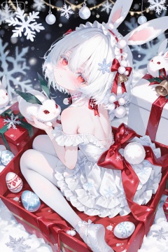 cyan color, white theme,loli, 1girl, snow rabbit, red eyes, animal ears, solo, snowflakes, dress, rabbit ears, sitting, white hair, white dress, rabbit, pantyhose, looking at viewer, christmas ornaments, bow, red bow, short hair, holding, white choker, white pantyhose, gift, rabbit tail, looking back, tail, pom pom (clothes), white footwear, box, closed mouth, christmas, ribbon, hairband, red ribbon, hair bow, blush, white hairband, backless dress, animal, rabbit girl, from above, pleated dress, hair ornament, headdress, hair between eyes, backless outfit, from behind, christmas lights, full body, bell, food, easter egg, choker, ballet slippers, frilled hairband, holding animal, shoes, frilled dress, layered dress, gift box, back bow, blurry, easter, frills, snow, fake animal ears, snowflake background, depth of field, bare shoulders, off-shoulder dress, sleeveless dress, pom pom hair ornament, looking up, snowflake print, hair ribbon