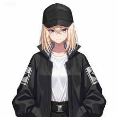 masterpiece, best quality,solo,white background,simple_background,Misumi Uika,cybersaki_style,blonde hair bangs,purple eyes,smile,medium hair,hair between eyes,white shirt,baseball cap,black coat,open coat,open clothes,jacket