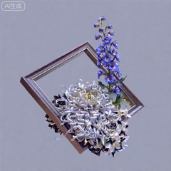 一个正方形的深色木制框架倾斜,被银色和黑色的菊花簇拥着。菊花花瓣卷曲且下垂,质感犹如光滑的丝带。一束飞燕草从框架里生长出来,绣球花填满了空隙。灰色背景。色彩柔和,赋予画面清冷、优雅的氛围,创造出一种疏离感。高清4k摄影,极致细节,着重表现花瓣细腻柔软的质感。