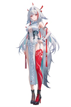 8k,best quality,masterpiece,(ultra-detailed),(high detailed skin),((artist:reoen),(artist:fuzichoco),(artist:atdan),(artist:torino_aqua),year 2024:0.8)1girl,[artist:wlop],[artist:ningen_mame],artist:ciloranko,[[artist:rhasta]],artist:tidsean,colorful,full body,full shot,standing,(solo:1.2),simple background,(white background:1.2),hand on own hip,(white background:1.1),looking at viewer,<lora:Ye_Shunguang-noob-Tanger-000014:0.8>,Ye Shunguang \(Zenless Zone Zero\),albino state,grey hair,grey animal ears,white fox tail,asymmetric red leg tattoos,extensive red left leg tattoo,single see-through horn,clothes: guang white def china dress,guang def white hairband,guang detached sleeves,red hair ribbons,1girl,long hair,breasts,red eyes,red hair,multicolored hair,high heels,streaked hair,