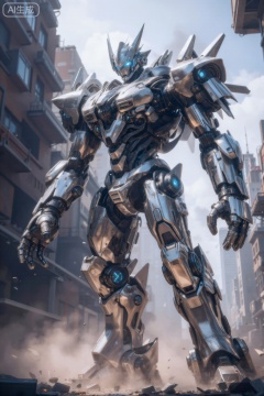 该图像展示了一个高耸、细节丰富的人形机器人站在城市环境中。该机器人的身体主要是金属银,其框架上可见复杂的机械部件。它采用时尚、棱角分明的设计,具有锋利的边缘和发光的蓝色装饰,尤其是在眼睛和关节周围。机器人的右臂举起,左臂垂在身侧,两只手臂的末端都是带有多个手指的大型机械手。胸部区域很宽,具有各种机械细节,包括看起来像是驾驶舱或控制中心的部分。背景由现代和工业建筑混合的高楼组成,天空部分多云。机器人下方的地面散落着碎片和灰尘,表明最近有过活动或移动。整体场景动感十足,机器人身上散发着力量感和先进科技感。,cjjj