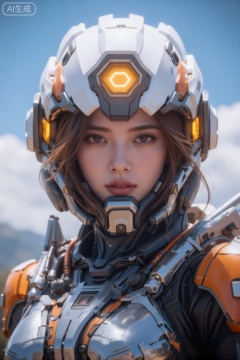 图像显示一个人穿着一套未来派的高科技盔甲。头盔主要是白色,带有橙色和灰色的点缀,额头上有一个发光的黄色六边形灯。头盔的面罩也发出黄色的光芒。套装本身是金属材质,混合了银色、灰色和橙色的成分。它具有复杂的机械细节,包括接头、电线和面板,赋予其复杂而先进的外观。背景是晴朗的蓝天和一些云,表明场景是在户外。总体印象是科幻或控制论人物,可能是技术先进的环境中的士兵或飞行员。,cjjj