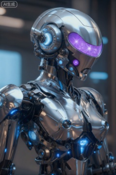 该图像描绘了一个高度详细的人形机器人,具有光滑的金属银色外观。该机器人的头部呈圆形,具有光滑的反光表面,具有突出的紫色发光眼睛,可发出柔和的星状图案。靠近眼睛的地方有一个圆形的机械眼窝,发出明亮的蓝光,暗示着先进的光学传感器。机器人的身体由互锁的金属板和复杂的机械部件组成,包括可见的齿轮、螺栓和液压活塞。蓝色LED 灯融入整个设计,突出关节、胸部和肩膀,营造出未来感和高科技的外观。机器人的姿势是直立的,略微倾斜,其左臂部分可见,展示了额外的机械细节和蓝色照明。背景模糊,具有模糊的冷色调灯光,增强了机器人的未来美感,强调了其先进的工程和设计。,cjjj
