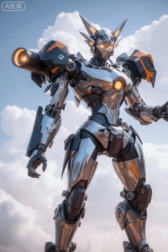 该图像展示了一个高度详细的未来机器人站在云彩分散的天空背景下。该机器人主要是银色的,带有黑色和橙色的点缀。它的设计时尚、棱角分明,具有人形形状,包括头部、躯干、手臂和腿。头部像头盔一样,有锋利、尖尖的耳朵和发着明亮光芒的黄色眼睛。胸部区域有一个圆形的、发光的黄色核心,表明有一个能量源。机器人的关节和四肢通过可见的机械部件进行铰接,包括活塞和齿轮。在它的左肩上,有一个黑色和橙色的盾状结构,上面有一个白色的小符号。机器人的右臂向前伸出,末端有一个圆柱状的大炮般的附肢,同样发出黄色的光芒。整体外观雄伟而先进,其设计让人联想到它是战斗或防御单位。,cjjj