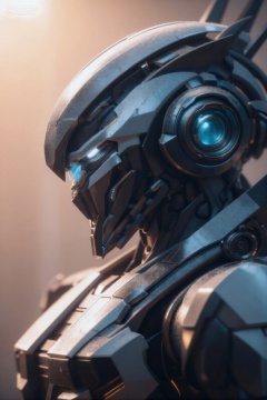 该图像展示了一个高度详细的未来机器人,具有时尚、棱角分明的设计。机器人的头部呈流线型,边缘锋利,眼睛像护目镜一样,发出明亮的蓝光。机器人的金属表面是深灰色和浅灰色调的混合,具有明显的纹理,表明有磨损和灰尘颗粒。 在机器人的肩膀上,有一个带有发光蓝色核心的大型圆形部件,周围环绕着复杂的机械细节。背景柔和地照亮了温暖的金色光芒,与机器人的冷色调形成了鲜明的对比。整体构图强调了机器人的先进技术和气势。,cjjj