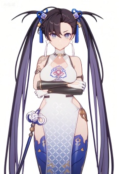 1girl, solo, long hair, breasts, looking at viewer, blue eyes, black hair, thighhighs, gloves, dress, twintails, jewelry, very long hair, earrings, white gloves, gradient, chinese clothes, china dressmasterpiece, best quality, transparent_background, game_cg, masterpiece, best quality, transparent_background, game_cg, arms_crossed, 😡,