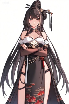 1girl, solo, long hair, breasts, looking at viewer, bangs, brown hair, black hair, hair ornament, dress, bare shoulders, very long hair, closed mouth, standing, chinese clothes