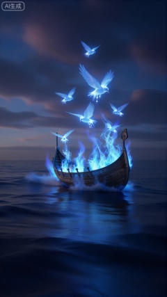 精美手机壁纸,Viking funeral ship engulfed in magical non-destructive blue flames, drifting to sea at twilight. Flames turning into birds of light ascending. Emotional, epic, fantasy illustration.
