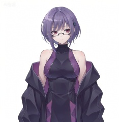 masterpiece, best quality,solo,white background,simple_background,Yuutenji Nyamu,cybersaki_style,short hair,purple eyes,red eyes,bangs,purple hair,breasts,hair ornament,glasses,jacket,bare shoulders,dress,off shoulder,open jacket,black jacket,sleeveless dress