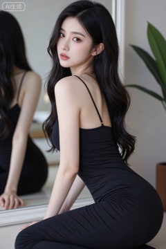 主体: 一位长发女性,身穿黑色吊带长裙,侧身坐在地面上,头部微微转向镜头,表情自然。背景中可见镜子和绿植。