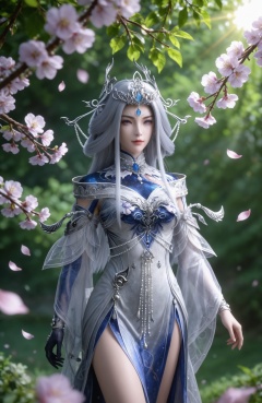 <lora:完美世界-银灵Pony:0.7> 1girl, hair ornament, blue eyes, jewelry, gem, tiara, long hair, white dress, grey hair, facial mark, bare legs,, realistic style photo,outstanding style,adding a touch of dimension to your images without compromising details,whirls of vapor,(Anime:1.1),ethereal ambiance,delicate details,magical atmosphere,concept art,highly detailed,ultra-high resolution,32K UHD,sharp focus,best-quality,masterpiece,golden hour,unconventional supreme masterpiece,masterful details,temperate atmosphere,with a high-end texture,in the style of fashion photography,magazine style,Dynamic Angle,Dynamic posture,magazine style,Dynamic Angle,Dynamic posture,(cowboy_shot:1.2),eye trail,depth of field,cinematic lighting,lens flare,extreme aesthetic,(wlop:0.6),(honjou raita,lack,rella,wanke:0.5),masterpiece,best quality,good quality,newest,year 2025,very aesthetic,absurdres,Visual impact,A shot with tension,ultra-high resolution,32K UHD,sharp focus,best-quality,masterpiece,Emotionalization,unconventional supreme masterpiece,masterful details,temperate atmosphere,with a high-end texture,in the style of fashion photography,(Visual impact:1.2),giving the poster a dynamic and visually striking appearance,, 1girl, solo, tree, branch, sunlight, outdoors, looking at viewer, blurry, standing, blurry foreground,sun light,Tyndall,cherry blossom,