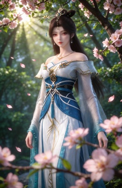 <lora:百炼成神3-玄鉴阁女侍Pony:0.7> 1girl, brown hair, hair ornament, hair bun, long hair, red eyes, jewelry, earrings, necklace, white dress, long sleeves, bare shoulders, blue dress, chinese clothes,off shoulder, 1girl, solo, tree, branch, sunlight, outdoors, looking at viewer, blurry, standing, blurry foreground,sun light,Tyndall,cherry blossom,, masterpiece,best quality,amazing quality,very aesthetic,high resolution,ultra-detailed,absurdres,scenery,photorealistic,looking at viewer,moody lighting,peach blossom,falling petals,realistic,photorealistic details,