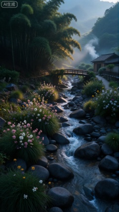 清晨的山间溪谷,薄雾如轻纱般漫过黛青色的山峦,阳光穿透云层,在苍翠的竹林间洒下斑驳的金辉。一条清澈的溪流从山谷深处蜿蜒而来,水底的鹅卵石清晰可见,水流撞击着岩石,泛起细碎的白沫,叮咚声在林间回荡。溪岸边长满了不知名的野花,粉白、鹅黄、淡紫点缀在翠绿的草丛中,几只彩蝶在花丛中翩跹。不远处,古朴的木桥横跨溪上,桥身爬满了青藤,桥的另一端是掩映在树荫里的青瓦小屋,袅袅炊烟顺着微风飘散,与山间的雾气融为一体,整个画面透着清新雅致的田园诗意。