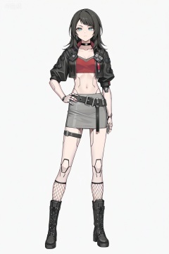 masterpiece, best quality,solo,white background,simple_background,Yahata Umiri,cybersaki_style,black hair,long hair,blue eyes,bangs,swept bangs,skirt,jewelry,jacket,earrings,choker,black jacket,red shirt,leather,leather jacket,navel,cropped jacket,android,joints,robot joints,boots,belt,black footwear,grey skirt,pencil skirt,fishnets