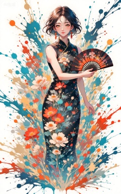 1girl,solo,dress,hand fan,holding,solo,earrings,jewelry,chinese clothes,china dress,black dress,holding fan,floral print,sleeveless,looking at viewer,sleeveless dress,folding fan,standing,head tilt,2,