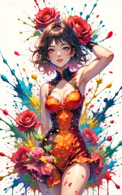 1girl, breasts, solo, polka dot, flower, dress, rose, polka dot dress, large breasts, red flower, armpits, petals, red rose, arms up, sideboob, sleeveless, frills, rose petals,