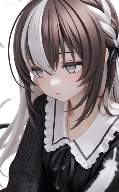 1girl,solo,braid,long_hair,frilled_shirt_collar,white_background,chair,ribbon,frills,simple_background,black_ribbon,black_cardigan,brown_hair,dutch_angle,upper_body,neck_ribbon,cardigan,grey_eyes,frilled_collar,parted_lips,feathers,multicolored_hair,expressionless,shirt,sweater,frilled_sailor_collar,sidelocks,hair_ribbon,sitting,two-tone_hair,hair_between_eyes,dress,looking_ahead,grey_hair,frilled_shirt,black_sweater,cable_knit,black_eyes,blush,black_dress,white_hair,on_chair,black_hair,