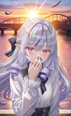 vivian banshee,1girl, virtual youtuber, solo, pointy ears, red eyes, black nails, long hair, covering own mouth, sketch, looking at viewer, black bow, multicolored hair, bow, hair bow, long sleeves, outdoors, sunset, upper body, feathers, purple hair, lens flare, shirt, diffraction spikes, streaked hair, hand over own mouth, grey hair, bridge, white shirt, nail polish, floating hair, covered mouth, cloud, evening, sun, backlighting, lolita fashion, sky