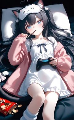 masterpiece,absurdres,best quality,high quality,chromatic_aberration,night,darkness,black theme,photorealistic,loli,loli,//,sleep mask,1girl,controller,animal ears,heart tail,cat tail,tail,blue eyes,game controller,cat girl,cat ears,food,mask on head,striped socks,virtual youtuber,sleeves past wrists,holding controller,long hair,pink cardigan,sleeves past fingers,eye mask,cardigan,black hair,looking at viewer,solo,heart,mask,mouth hold,holding game controller,animal ear fluff,holding,open cardigan,hair ornament,socks,white dress,pocky,tail ornament,chips (food),food in mouth,ahoge,dress,blush,hair between eyes,pillow,pocky in mouth,striped clothes,long sleeves,bow,notice lines,two side up,lying,open clothes,signature,potato chips,bag of chips,on back,loose socks,feet out of frame,loungewear,pink jacket,tail bow,heart ahoge,leg warmers, <lora:Nano_amei5up:0.8>