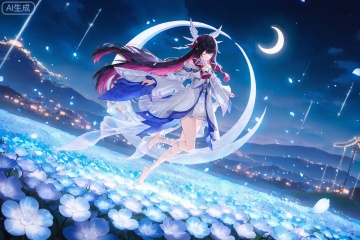 black hair,long hair,blunt bangs,shaonv white eyes mask,multicolored hair,gradient hair,pink hair,purple hair,streaked hair,two-tone hair,very long hair,wing hair ornament,colored inner hair,clothes:shaonv white short dress,shaonv detached sleeves,shaonv gradient dress,shaonv halter dress,shaonv leg ribbon,shaonv long sleeves,shaonv off-shoulder dress,shaonv wide sleeves,shaonv wrist bow,shaonv wrist ribbon,1girl,solo,closed eyes,bare legs,bare shoulders,barefoot,detached sleeves,(jumping:1.1),closed mouth,night,flower field,white flower,crescent_moon,,lvjing,floating petals,dancing,(dynamic_angle:1.1),(dutch angle:1.1),glowing,outdoors,bug,firefly,