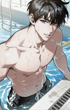 Anime style, 1 young man, (seductive gaze:1.4), (confident smirk:1.3), (sparkling eyes), (looking_at_viewer:1.6), against a blurred background of a swimming pool with sparkling water, (dynamic pose: slicking his wet hair back), wearing **only wet, clinging black swim trunks**, (water dripping from his body and hair), (glistening skin), intricate details, bright blues and cyans, sharp focus, cel-shading, anime key visual, ultra HD, 8k, masterpiece, best quality.
