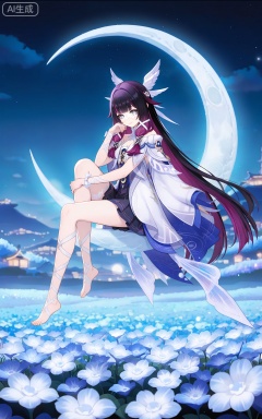 black hair,long hair,blunt bangs,shaonv white eyes mask,multicolored hair,gradient hair,pink hair,purple hair,streaked hair,two-tone hair,very long hair,wing hair ornament,colored inner hair,clothes:shaonv white short dress,shaonv detached sleeves,shaonv gradient dress,shaonv halter dress,shaonv leg ribbon,shaonv long sleeves,shaonv off-shoulder dress,shaonv wide sleeves,shaonv wrist bow,shaonv wrist ribbon,1girl,solo,looking at viewer,closed mouth,smile,bare shoulders,barefoot,floating,night,moon,flower field,wihite flower,sitting on the moon,crescent moon,