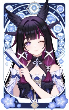 ,black hair,long hair,blunt bangs,multicolored hair,gradient hair,pink hair,purple hair,streaked hair,two-tone hair,very long hair,wings hair ornament,colored inner hair,purple eyes,shaonv symbol-shaped pupils,