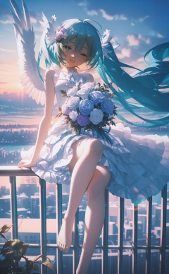 masterpiece,absurdres,best quality,high quality,chromatic_aberration,//,1girl, bouquet, solo, on railing, dress, hatsune miku, flower, wings, holding bouquet, long hair, sky, railing, white dress, one eye closed, cloud, floating hair, very long hair, white flower, outdoors, backlighting, sitting, sleeveless, barefoot, purple flower, holding, angel wings, twintails, sleeveless dress, blue hair, bare arms, white wings, feathered wings, white rose, blue theme, hair flower, cityscape, foot out of frame, rose, cloudy sky, horizon, hair ornament, sunrise, smile, blue eyes, blue sky, purple rose, open mouth, bare shoulders, ocean, city, plant, knee up, wind, frills, sunlight, frilled dress, blurry, arm support, building, bare legs, dawn, aqua eyes, looking at viewer, blue flower, sunset, ahoge, aqua hair, leaf, depth of field, layered dress, lens flare//,//,<lora:konya_karasue——【CKXL】hans:1>,