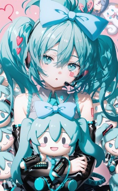masterpiece,absurdres,best quality,high quality,chromatic_aberration,//,hatsune_miku,1girl,solo,cinnamoroll,character_doll,bow,?,shirt,hair_bow,necktie,looking_at_viewer,hair_ornament,detached_sleeves,aqua_necktie,heart,long_hair,aqua_eyes,number_tattoo,black_sleeves,sleeveless_shirt,bare_shoulders,aqua_hair,twintails,sleeveless,upper_body,blue_bow,hair_between_eyes,tattoo,skirt,hugging_object,:o,updo,fish_hair_ornament,holding_doll,miku_day,open_mouth,black_skirt,headset,heart_hair_ornament,arm_tattoo,grey_shirt,stuffed_toy,collared_shirt,blue_necktie,headphones,hugging_doll,parted_lips,belt,//,//,<lora:konya_karasue——【CKXL】hans:1>,