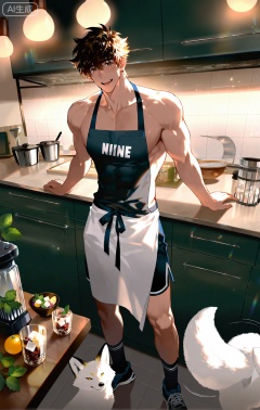 wearing (a simple apron over a **** top and shorts:1.5),(nine fluffy white fox tails, wagging slightly as he concentrates:1.5),