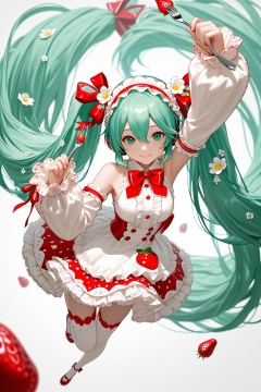 masterpiece,best quality,high quality,newest,highres,8K,HDR,absurdres,dynamic pose,fork,1girl,solo,very long hair,long hair,strawberry miku,thighhighs,twintails,dress,green eyes,detached sleeves,bow,looking at viewer,flower,holding fork,white thighhighs,frills,green hair,hair ornament,ribbon,holding,white flower,long sleeves,hairband,bangs,white background,hair between eyes,absurdly long hair,hair flower,full body,frilled dress,hair ribbon,smile,sleeveless,food,red bow,foreshortening,depth of field,