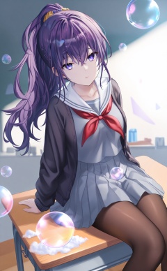 masterpiece,absurdres,best quality,high quality,chromatic_aberration,//,1girl, asahina_mafuyu, solo, miyamasuzaka_girls'_academy_school_uniform, school_uniform, grey_serafuku, neckerchief, pantyhose, purple_hair, skirt, red_neckerchief, sitting, grey_skirt, sailor_collar, bubble, black_cardigan, serafuku, pleated_skirt, cardigan, long_hair, ponytail, shirt, open_cardigan, long_sleeves, sitting_on_desk, holding, desk, closed_mouth, black_pantyhose, high_ponytail, blue_eyes, on_desk, scrunchie, hair_scrunchie, open_clothes, white_sailor_collar, arm_support, purple_eyes, grey_shirt, looking_at_viewer, expressionless, hair_ornament, school_desk, bubble_blowing, yellow_scrunchie, triangle, hair_between_eyes, brown_pantyhose, collarbone, soap_bubbles//,//,<lora:timmoo——【CKXL】hans:1>,